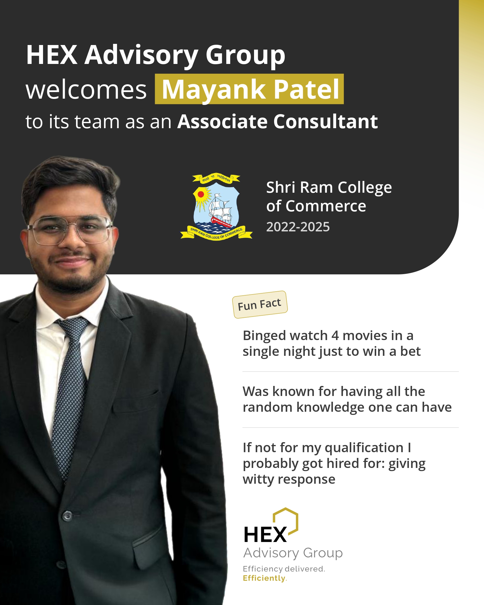 Mayank Patel joins us as Associate Consultant, bringing fresh perspectives from Shri Ram College of Commerce. Known for his quick wit and diverse knowledge, Mayank’s energy and sharp thinking make him a valuable addition to our consulting team.