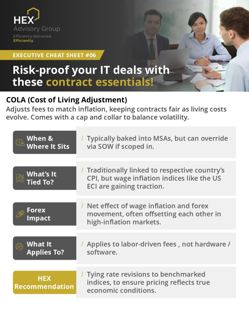 In this hyperinflationary environment, COLA, once a standard provision, is gaining increasing prominence. And rightly so, as a typical managed services contracts spans 5 years and a robust COLA mechanism/clause that protects the interests of both parties is critical to an equitable contract. It is also in the interest of both Buyer and Seller to include a Benchmarking clause that allows potential commercial ‘reset’ in an uncertain business environment.