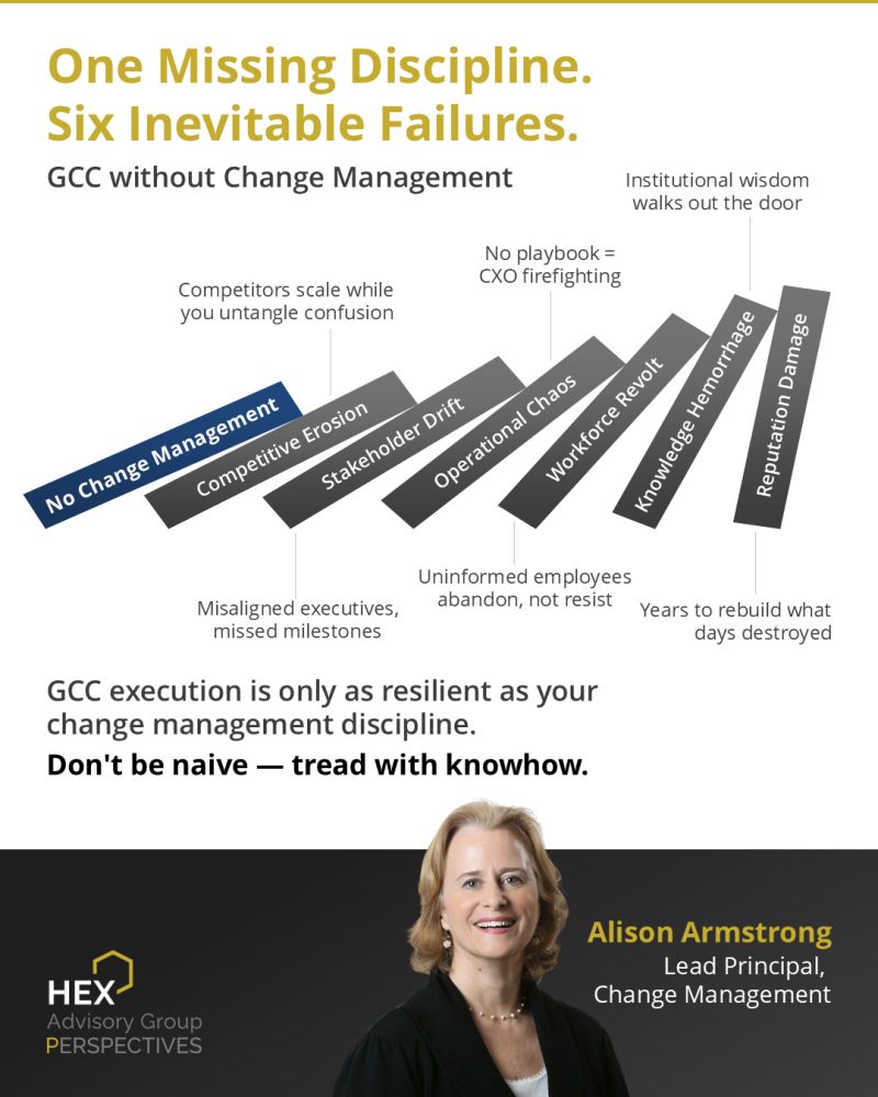 HEX Advisory Group specializes in hands-on GCC execution with referenceable CXO clients, senior sourcing practitioners like Alison Armstrong, MSM MIS who helped us put together this POV from her experience from her client engagements over the years.